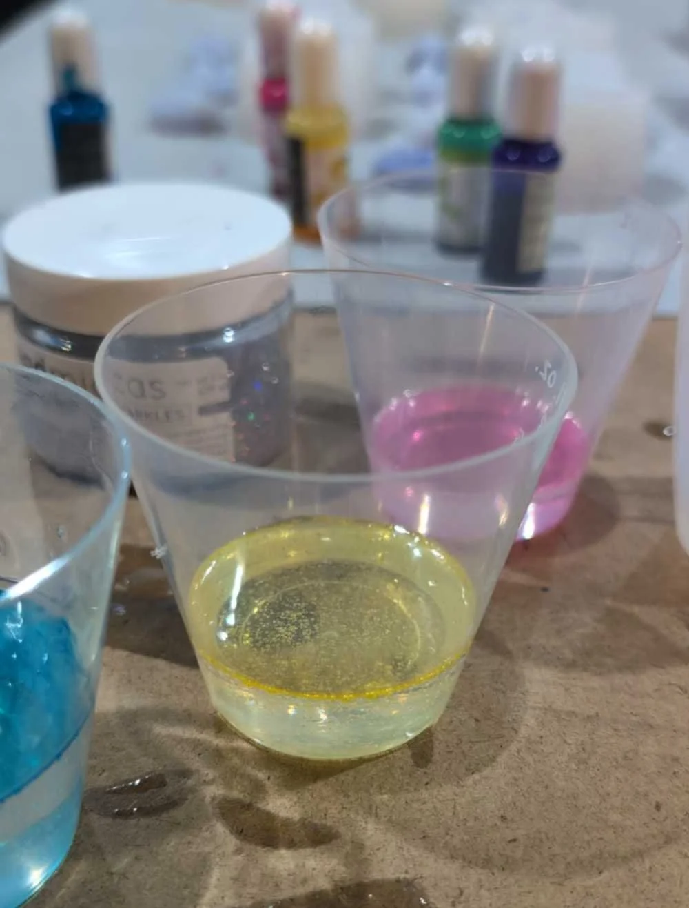 The fun part! Like a mad scientist, we suit up in our protective gear and gather all our materials. Using quality colorants, glitters, shimmers, and mica powders, we mix various cups of resin and pour into the molds using techniques that give a desired effect.