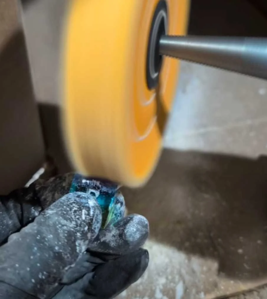 Once fully cured, we sand all rough faces with 600-2000 grit sandpaper in preparation for the their final polish. Using a jewelers polishing wheel, we bring the dice to a mirror finish. Any leftover polishing compound stuck inside the numbers is scrubbed out. This process takes anywhere from 1-2 hours per set, but it's one of our favorite parts. The dice look absolutely amazing at this stage and it gets us excited to finish them up.